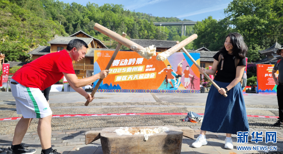 5月2日,两名游客参加“景区天天运动会”打糍粑项目体验。新华网 卢志佳 摄