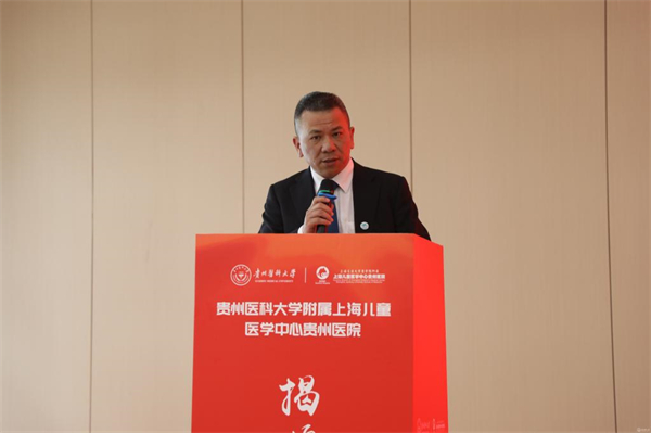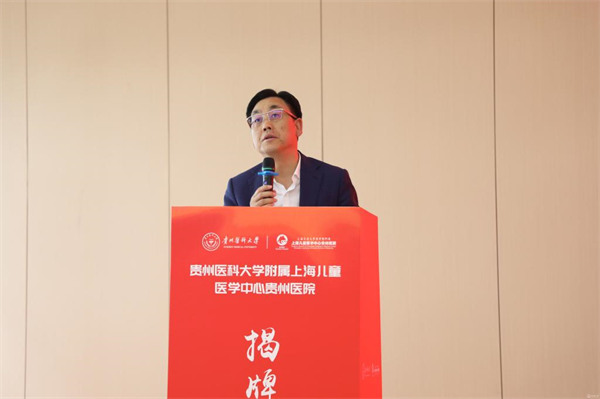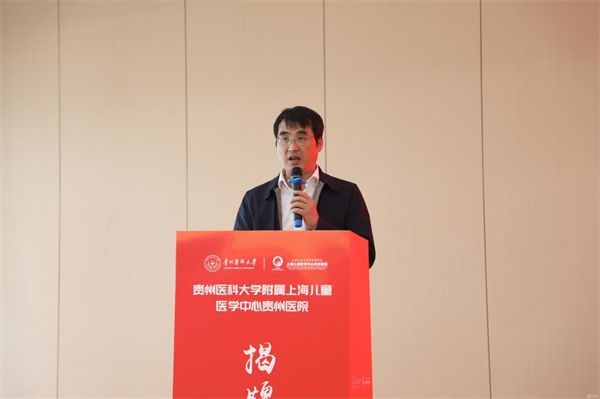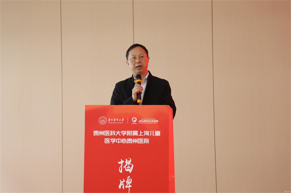 会上,安仕海代表省卫生健康委对贵州医科大学附属上海儿童医学中心贵州医院揭牌表示热烈祝贺。他指出,此次揭牌不仅为医院未来的发展搭建了更广阔的平台,也为学校培养出更多适应社会需求、具有创新精神和实践能力的高素质医学人才提供了优质的临床教学和实践机会。希望充分发挥双方优势,共同推动儿科医学教育、科研和临床实践协同发展,努力打造西南地区儿科医学高地,为贵州人民提供更加优质高效便捷的医疗服务。