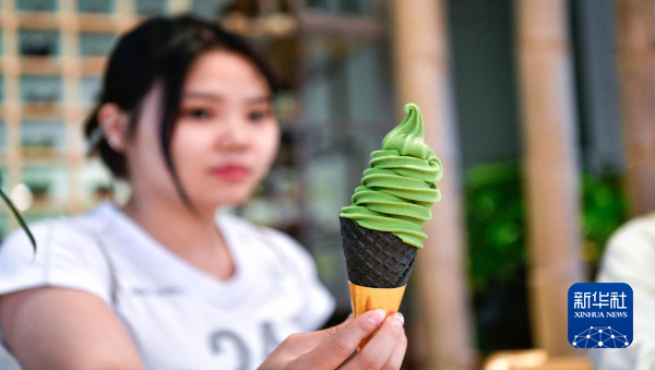 5月15日,在江口县一家抹茶产品体验店,顾客展示抹茶冰淇淋。新华社记者 杨文斌 摄