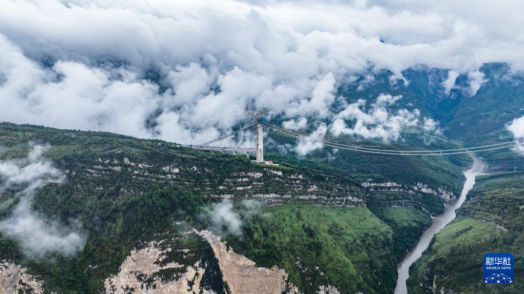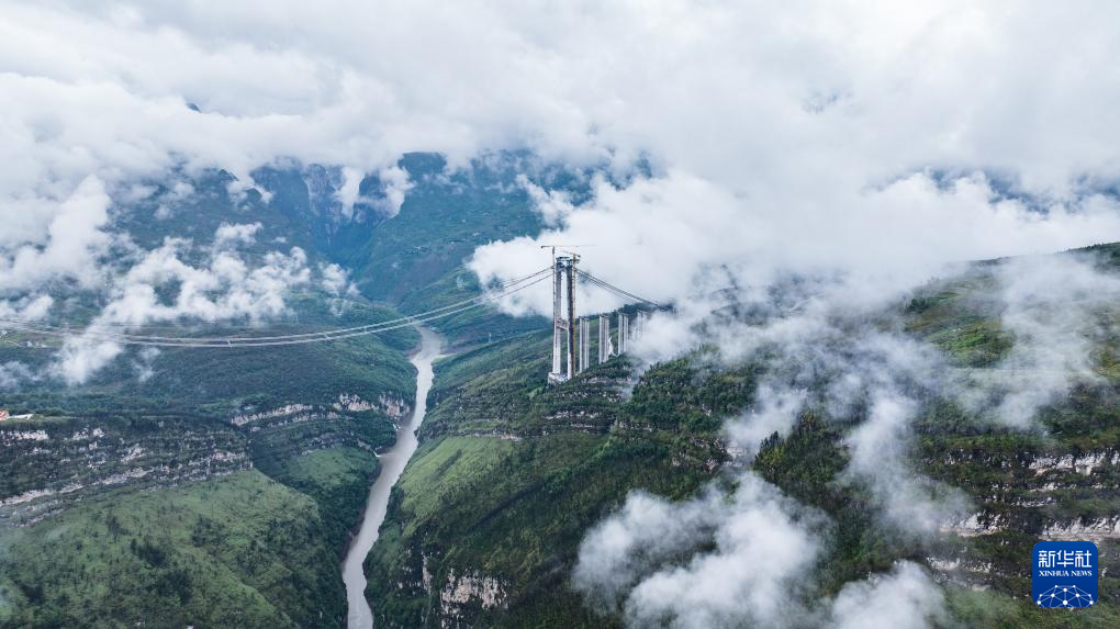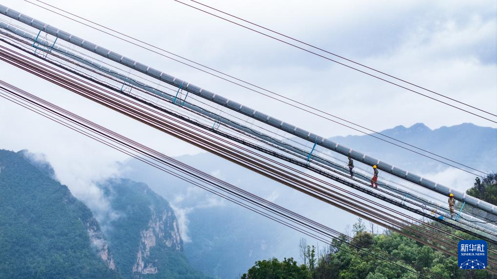 工人在施工猫道上行走,前往作业地点(5月28日摄,无人机照片)。新华社记者 陶亮 摄